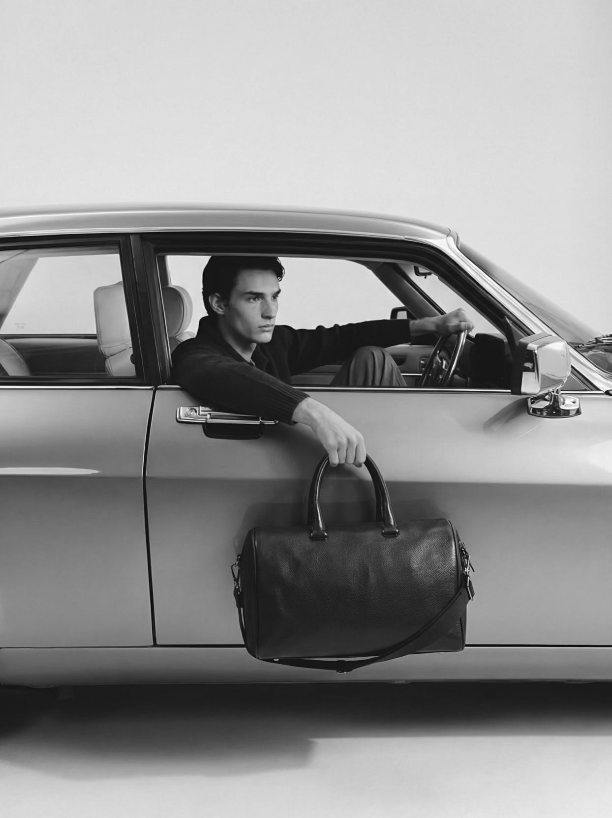 Weekend bag in soft leather featuring a detachable webbing shoulder strap with a slide buckle